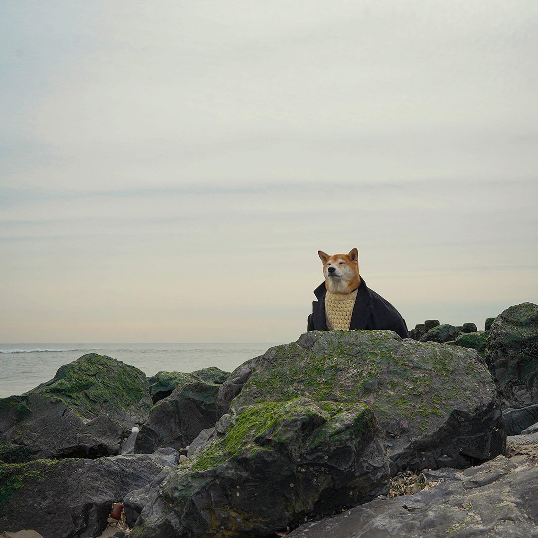 A play on Ernest Hemingway's short novel "The Old Man and the Sea," Bodhi channels a fisherman (Santiago), contemplative at Sea wearing a classic ensemble: A chunky aran wool sweater, a navy peacoat and a classic greek fisherman's hat